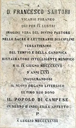 Francesco (1826-1897), son of Carlo and Catherine Finco, studied at the Seminary of Padua and was ordained a priest in 1849. He was chaplain of Saint Bartholomew in Crosara, parish priest in Mellame, and then took over as archpriest of the parish of Campese, in Bassano, where he was highly esteemed for his pastoral work. He restored the Benedictine monastery in 1855 and the parish church in 1870, which was declared a National Monument in 1878; he was a poet, a prolific historian, and for his merits was awarded the Order of Saints Maurice and Lazarus in the rank of Knight.[46][94][69]