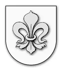 Another group, originally from Enego, obtained citizenship of Vicenza in 1582, and by 1599 they already had coats of arms. This group used at least two other variants of this coat of arms: one with the gold lion and the silver scissors, and another documented in Bassano del Grappa in 1615 at his tomb in the Church of Saint Francis, with the green lion, the gold upper field, the purple band and a red band between the two fields.[38]