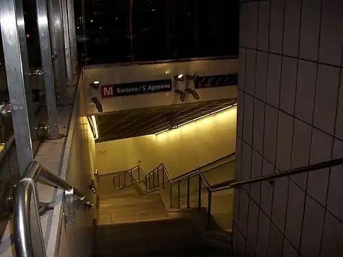 Sarzano/Sant'Agostino is a Genoa Metro station, located in the historical centre of Genoa, Italy. The main entrance is in the Piazza di Sarzano near the Church of St. Augustine, now deconsecrated and turned into a museum, with a second entrance on the Mura della Marina, the old seawall. It is the newest station, having opened on 3 April 2006, about a year after the easterly terminus at De Ferrari.[1]