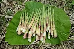 The young shoots of some Sasa species are edible. Sansai (literally translated as 'mountain vegetables') traditionally refers to vegetables that have grown in the wild and then foraged by humans, as opposed to being cultivated or farmed.[32] Young culms of Sasa kurilensis are known in Japan as chishima-zasa (チシマザサ) or nemagaridake and are particularly popular in Hokkaido and other parts of northern Japan.[32][33]