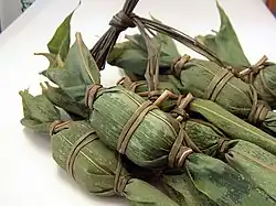 Chimaki are a type of dumpling from Japan, very similar to the Chinese dumpling zonghi but with different fillings. Chimaki usually consist of a mixture of glutinous rice and other ingredients which are carefully wrapped in a Sasa bamboo leaf and usually tied with rushes before steaming. Chimaki may be savory, composed of rice, meat and vegetables, or sweet, containing sticky glutinous rice, yokan (sweet red bean gelatin), or kudzu.[61] Chimaki are particularly associated with Akita, Niigata, Yamagata, and the Aizu region of Fukushima Prefecture, with unique local variations. In Akita, sasamaki is prepared in a comparable way but consists of only glutinous rice wrapped in Sasa leaves, tied with rushes, and steamed reflecting a time when glutinous rice was less abundant and more expensive than Uruchi rice, so it has long been used as a celebratory food.[62]