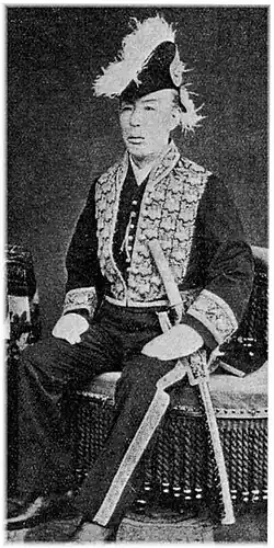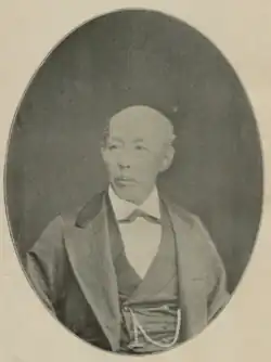 During the Boshin War of 1868–69, Kubota Domain was a signatory to the pact that formed the Ōuetsu Reppan Dōmei,[2] the alliance of northern domains led by the Sendai Domain. The Satake clan's delegation at Shiroishi, the alliance's headquarters, was led by the clan elder (karō) Tomura Yoshiari.[3][4] However, the Satake had political difficulties with the alliance, which culminated in the murder,[5] in Akita, of a delegation from Sendai on August 21, 1868,[6][7][8] and the display of the messengers' gibbeted heads at Kubota Castle.[9] The delegation, led by Shimo Matazaemon, was dispatched to request Kubota Domain to hand over Kujō Michitaka and other officials of an imperial delegation that had been originally sent to the region to gather support for the imperial cause.[10] The Satake then backed out of the alliance and supported the imperial army; eleven days later, on September 1, 1868[11] the Tsugaru clan of the neighboring Hirosaki Domain followed suit.[7][12] In response, the pro-alliance domains of Morioka and Ichinoseki Domains sent troops to attack Kubota.[13] Kubota forces were hard-pressed to defend their territory, with the result that the alliance troops had made serious advances by the time the war ended in northern Honshū.[13] In early 1869, Satake Yoshitaka formally gave up the domain's registers to the imperial government, and was made imperial governor of Akita (han chiji).[14] In mid-1869, the imperial government rewarded Kubota by raising its kokudaka by 20,000 koku.[14]