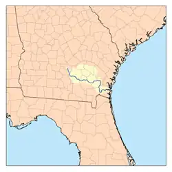 The Satilla River rises in Ben Hill County, Georgia, United States, near the town of Fitzgerald, and flows in a mostly easterly direction to the Atlantic Ocean. Along its approximately 235-mile (378 km)[1] course are the cities of Waycross, Waynesville, and Woodbine. The Satilla drains almost 4,000 square miles (10,000 km2) of land, all of it in the coastal plain of southeastern Georgia. It has white sandbars and is the largest blackwater river situated entirely within Georgia.[2][3] The Satilla enters the Atlantic Ocean about 10 miles (16 km) south of Brunswick, at the 31st parallel north. Satilla River Marsh Island[4] The river derives its name from a Spanish officer named Saint Illa, and over time the name was corrupted to form the word Satilla. French explorer Jean Ribault named the river the Somme when he encountered it in 1562. The river was later given the name Aisne by Jacques le Moyne.[5]