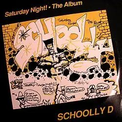 Saturday Night! – The Album was first released on Schooly-D Records in 1986.[4][1][13] On the album's Jive Records re-release, it charted on Billboard's Top Black Albums for ten weeks peaking at number 59.[14][15] In the United Kingdom, the album was released by Mute Records affiliate called Rhythm King where it charted on the UK Indie Charts for 10 weeks peaking at number four.[10][16] Singles for the album included "Saturday Night" and "Dedication to All B-Boys" released on Schooly-D Records and Flame Records.[12][16] Both "Saturday Night" and "Dedication to All B-Boys" appeared on the UK Indie Charts.[16] On its release, Philadelphia's city officials had the album removed from store shelves after public outrage over the violent content in the songs.[17]