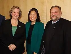 Rhodes-Conway's campaign focused on a short list of issues, including bringing bus rapid transit to Madison, increasing the supply of affordable housing, combatting climate change, and promoting racial equity.[23] During the primary, Rhodes-Conway's support came largely from the Isthmus and neighboring wards.[24][25] Debates between Rhodes-Conway and Soglin covered a number of topics,[26][27] including affordable housing,[28] the municipal economy,[29] public safety, and policing.[30] Rhodes-Conway won support from Wisconsin State Assemblywoman Terese Berceau and Dane County Executive Joe Parisi.[31][32] She was subsequently endorsed by the Wisconsin State Journal editorial board,[33] The Capital Times,[34] and The Daily Cardinal.[35] Throughout the campaign, Rhodes-Conway raised more money than Soglin,[36] and spent more on expenditures.[37][38] Milwaukee County Executive Chris Abele spent $47,000 on mailings supportive of Rhodes-Conway's mayoral bid, an amount described by the Wisconsin State Journal as "unusual, if not unprecedented," due to its origin outside of Dane County.[39]