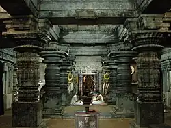 The temple is three shrined (trikutachala),[8] has a garbhagriha (sanctum), and a vestibule (antarala) that connects the sanctum to the a closed mantapa (inner hall, navaranga) which opens into a large pillared gathering hall (mahamantapa). According to Percy Brown and Gerard Foekema, these are standard features in a Hoysala temple.[7][9] The closed hall has two lateral shrines, one in the north and the other in the south. To the east, the large hall opens onto the platform that is meant for clockwise Circumambulation by devotees since the inside of the temple does not provide any such feature.[4][10] On the platform, the base of the temple (called adhisthana) consists of moldings that take the stellate form of sanctum but become staggered square at the mahamantapa. The outer wall of the shrine and the large hall are single pilastered turreted walls. The tower over the shrine (shikhara) is plain without the typical ornamentation giving the temple as a whole an austere look.[2] The temple gets its name from the "serene" (lit, "Saumya") six feet tall image of Keshava, a form of the Hindu god Vishnu that stands on a garuda (eagle) pedestal.[11] The roof of the closed mantapa is supported by lathe turned pillars, a standard feature in Hoysala constructions.[12] These pillars divide the ceiling into "bays" (four central pillars create 9 bays in the closed hall) that are exceptionally well treated.[2][13]