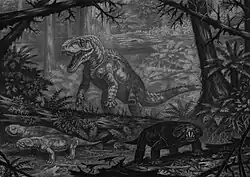 Saurosuchus was unearthed in the Cancha de Bochas Member from the Ischigualasto Formation, being the major predator on its environment.[3] The Ischigualasto Formation was dominated by fluvial and floodplain environments with strongly seasonal rainfalls. Interlayered volcanic ash layers above the base and below the top of the formation provide chronostratigraphic control and have yielded ages of 231.4 ± 0.3 Ma and 227 ± 0.9 Ma respectively.[14]