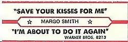"Save Your Kisses for Me" was released as a single in May 1976 via Warner Bros. Records. It was Smith's first single issued by the label, after previously recording for Sugar Hill and 20th Century Fox. The song reached the tenth position on the Billboard Hot Country Singles chart in the fall of 1976. The single became Smith's second top-ten single on the country chart and would start a series of major hits for her.[53] In July 1976, the single was released on Smith's first studio album for Warner Bros. Records entitled Song Bird.[49] Margo Smith's version of the song is the most successful cover of "Save Your Kisses for Me" to date.[53]