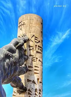 Saving Iraqi culture (Arabic: نصب انقاذ الثقافة, romanized: Nasb Enqath al-Thaqafa) is a monument located in the Mansour district of Baghdad. It was commissioned in 2010 by the Mayor of Baghdad and designed by Iraqi sculptor Mohammed Ghani Hikmat.[1] The monument shows a broken cylinder seal, with hands and arms attempting to support it so as not to fall.[1] The cuneiform on the seal reads writing began here.[1]