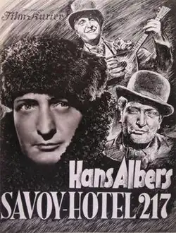 Savoy Hotel 217 (German: Savoy-Hotel 217) is a 1936 German mystery drama film directed by Gustav Ucicky and starring Hans Albers, Brigitte Horney and Alexander Engel.[1] It was shot at the Babelsberg Studios in Potsdam.[2] The film's sets were designed by the art directors Robert Herlth and Walter Röhrig. The costumes were by Herbert Ploberger. It premiered at Berlin's UFA-Palast am Zoo.