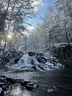 It flows predominantly through forests and farmland. Just above its mouth, it descends more steeply through a wooded area with several waterfalls into South Tivoli Bay, between the Montgomery Place estate and Bard College, which uses the stream as both its primary water source[3] and for disposal of its treated wastewater.[4] In the 1840s, the owners of those properties made an agreement to prevent development along the stream, one of the earliest such conservation measures in American history.[5]