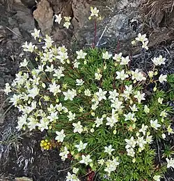 Matte saxifrage is a short perennial mat-forming plant. The mat consists of an extended cluster of leaf rosettes growing from a rhizome, each rosette consisting of densely overlapping lanceolate entire leathery leaves up to 1.5 cm long with prominent short stiff hairs on the margin and terminated by a spine-like tip about 1 mm long. Leaves are green, often with reddish tips and lower surfaces. The green to red floral stem is up to 20 cm tall and is sparsely covered with similar but smaller leaves, terminating in a branched cluster of 2 to 15 flowers (usually 3 to 5), each with five white to yellowish-white oblong petals with small dark red to yellow spots. Each flower has several prominent long white stamens that radiate above the petals and a roughly cone-shaped white ovary in the center (superior). Though each flower is small, plants can form extended mats and often produce a showy profusion of flowers in season.[1]