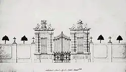 View of The Saxon Establishment from the north painted by Bernardo Bellotto il Canaletto of 1764 shows a main entrance to the palace from Wielopole with The Iron Gate and the 21 m-high garden gloriette, so-called Great Salon.[4]