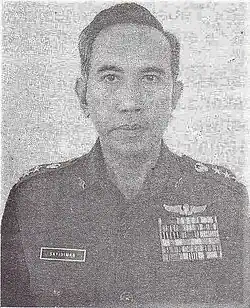 Sayidiman was inaugurated as the Commander of the Hasanuddin Military Region on 3 August 1968, replacing Solichin GP, the previous commander.[21] Sayidiman's appointment as a commander of a military region marked his service in a total of four different military fields: combat, education, staff, and territorial.[22] Under his command, the military region launched Operation Lighting (Operasi Kilat) to exterminate communists rebels who sided with the 30 September movement.[23] The operation resulted in the execution of Marcus Girat, the leader of communist guerilla groups in the Eastern Indonesia region and the arrest of Muhammad Kasim,[23] the incumbent regent of Buton who was accused of being involved in the movement.[24] Sayidiman ended his tenure in the region on 16 March 1970 and was replaced by Abdul Azis Bustam.[25]