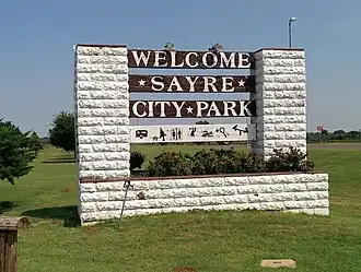 The Sayre City Park is a public park located along historic U.S. Route 66 on the south end of Sayre, Oklahoma. The park formally opened in 1940; however, the land had been owned by the city and used informally as a park for several years prior. The Works Progress Administration built the park's structures according to plans designed by J.N. Willis. The park's bathhouse and swimming pool, the dominant features of the park, have a Pueblo Revival design with ornamental vigas. Other park features include a miniature golf course, a gazebo, and tennis courts. The park attracted both locals and travelers on Route 66, who regularly camped in the park. A local business district also developed around the park, primarily to serve tourists.[2]