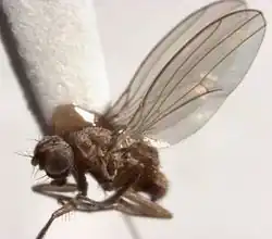 Scaptomyza flava is an herbivorous leaf mining fly species in the family Drosophilidae. In Latin, flava means golden or yellow.[1] The fly is amber to dark brown in color and approximately 2.5 mm in length.[2][3] In Europe and New Zealand[4][5][6] the larvae are pests of plants in the order Brassicales, including arugula, brassicas, broccoli, Brussels sprouts, bok choy, cabbage, canola, cauliflower, horseradish, kale, kohlrabi, napa cabbage, nasturtium, radish, rapini, rutabaga, turnip, wasabi and watercress.[4] In New Zealand, its range has expanded to include host species that are intercropped with salad brassicas, including gypsophila, otherwise known as baby's breath, which is in the pink family (Caryophyllaceae) and the pea (Pisum sativum) in the Fabaceae.[6] More typically, S. flava is oligophagous within the Brassicales. Scaptomyza are unusual within the Drospophilidae because the group includes species that are truly herbivorous.[7][8][6] Other herbivorous drosophilids include D. suzukii, which attacks fruit very early during ripening[9] (and so is a frugivore) and species within the genus Lordiphosa, from Africa and Asia, which also include leaf miners.[10] Most drosophilids feed on microbes associated with decaying vegetation and sap fluxes.[11]