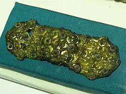 Grave goods found next to the man include a sword, a quiver with arrows, a bone comb, and gaming pieces. Found next to the woman was a whalebone plaque (pictured) that has become known as the Scar Dragon Plaque, and a gilded brooch. Goods found next to the woman included a comb, shears, a sickle, and two spindle whorls.[3] No evidence was found of how any of the three occupants died.