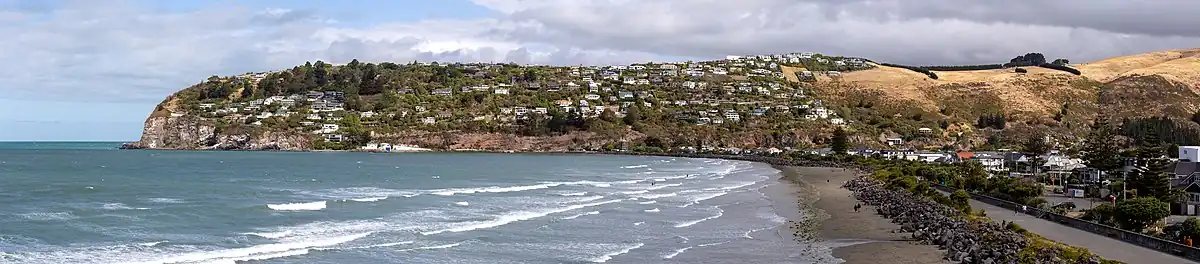 Scarborough is located between Sumner and Te Onepoto / Taylors Mistake.[3] It was named for the seaside resort in North Yorkshire, England.[4] The first European owner of most of the land was Major Alfred Hornbrook,[5] whose Mount Pleasant run stretched as far east as Godley Head. A small land parcel of 25 acres (10 ha) near present-day Nicholson Park belonged to Charles Church Haslewood, who died in May 1858 when his hunting gun discharged while he looked down the barrel.[3]
