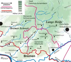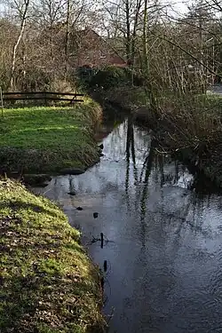 The Schönebecker Aue's total length is 17.7 km (11.0 mi), of which the last 3.1 km (1.9 mi) are in the city of Bremen.[2] The stream's source is on the Lange Heide, a geest plateau north of Bremen in Osterholz-Scharmbeck, which is also the source of several other geest streams (e.g.: the Drepte, Giehler Bach, Scharmbecker Bach and Wienbeck).