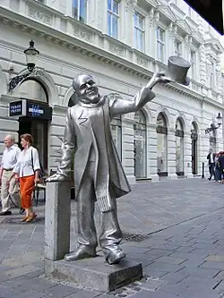 Schöner Náci was the son of a shoemaker and grandson of a famous clown, also Ignác Lamár, and was inspired by the latter's example to bring happiness to the streets of the city. He walked around the Old Town and in particular the stretch from Michael's Gate to the river, in top hat and tails, greeting women with the words, “I kiss your hand” in German, Hungarian and Slovak. He received free food from several of the city's cafes, and supported himself with occasional cleaning work.[2]