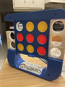 Oh Chute! is a two player game. It was advertised as "a family game full of surprises." The object is to line up 3 discs of the same color in a row horizontally, vertically or diagonally. A play consists of either playing a disc or moving a slide one hole to either side. Moving a slide may cause a disc to fall out of the frame changing the entire pattern of play.