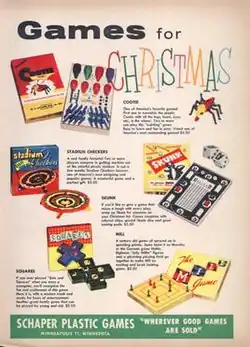 Schaper Toys, or W.H. Schaper Mfg. Co., Inc. as it was originally known, was a game and toy company founded in 1949 by William Herbert Schaper in Robbinsdale, Minnesota. "Herb" Schaper published a variety of games but was best known for having created the children's game, Cootie.[1] In 1971, the company was sold to Kusan, Inc., and began operating as Schaper Toys, a subsidiary of Kusan, Inc. In 1986, Schaper Toys was acquired by Tyco Toys, which sold the rights to Cootie and three other of the company's best-known games to the Milton Bradley Company. These games are still being sold.[2][3]