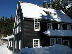 In 1869, the stage manager of the municipal theater in Freiburg built and ran a cottage to the south-west of the peak. After various changes, the guest house "Zur Friedrichsruhe" emerged, also known as "Berghotel Schauinsland" (mountain hotel Schauinsland). After a fire in 1926, the house was reconstructed to its current form. From 1936 to 1982, Heinrich Sauerer ran the mountain hotel together with his family. Afterwards, the workers' welfare union ran the guesthouse as a conference and meeting place for groups for thirteen years. As of 2006, the house, including 50 beds, can be fully rented. It is also the location of a detective novel.[2]