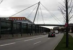 To connect the area around Berliner Straße, south of the Schenkendorfstraße, with the district of Alte Heide in the north, the pedestrian bridge over the Schenkendorfstraße was built in 1985, a suspension bridge with A-shaped pylons and only one support cable. Cable suspended bridge and glass enclosure