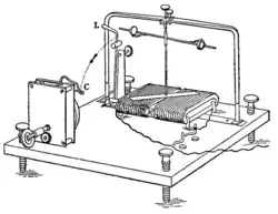 The calling needle was similar to the signal needles with some additional mechanical apparatus. The needle was suspended by metal wire, rather than a silk thread, and had attached to it a horizontal arm. When a call was made the arm turned and pushed over a lever with a lead weight attached which fell under gravity and released the detent of a clockwork alarm. In specifying a separate calling line and mechanism, Schilling was following the arrangements on the electrochemical telegraph of Samuel Thomas von Sömmerring.[10] Schilling had become familiar with Sömmerring's work while a diplomat in Munich and frequently visited Sömmerring to see and assist with his telegraph.[11]