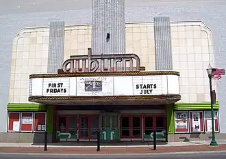 Schine's Auburn Theatre is a historic theatre building located at 12-14 South Street between Genesee and Lincoln Streets in Auburn, New York. It is currently owned[2] by the City of Auburn N.Y. It is an outstanding example of the later Art Deco style of architecture in the Streamline Moderne vein designed by the noted theatre architect John Eberson. It was completed in 1938 and features a ceramic brick and terra cotta facade, a stylized marquee, and a 2,000 seat auditorium with a complex arrangement of flat and curvilinear wall and ceiling surfaces and reveals and decorated with a shooting star motif.[3]