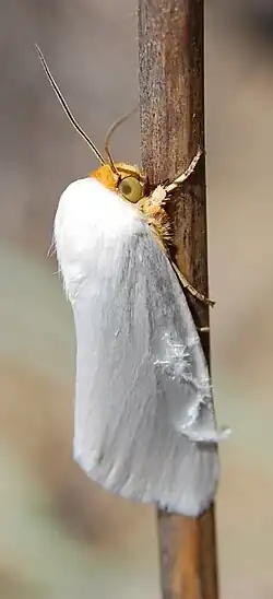The appearance of white flower moth larvae is unknown. The wings, thorax, and abdomen of adult moths are completely white, while the head is orange.[1][5] Adults have a wingspan of about 30 mm (1.2 in).[1][5]