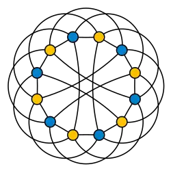 The intersection graph of the twelve lines of the double six configuration is a twelve-vertex crown graph, a bipartite graph in which each vertex is adjacent to five out of the six vertices of the opposite color.[6] The Levi graph of the double six may be obtained by replacing each edge of the crown graph by a two-edge path. The intersection graph of the entire set of 27 lines on a cubic surface is the complement of the Schläfli graph.[7]