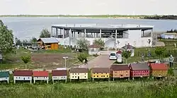 Since August 2003 there are four volleyball courts suitable for tournaments at Schladitzer Bucht (Schladitz Bay) on the Schladitz side of the lake (the southeast side).[5] Since then, beach volleyball, beach handball and beach soccer tournaments are held regularly during the season.[1] Among other things, the qualification for the German championships in beach volleyball, the „Sachsenmasters“, is held here. The Schladitz Bay was managed by a water sports school from June 2003 and from 2013 it was expanded into a sports resort with water sports offers and courses, accommodation and camping.[6]