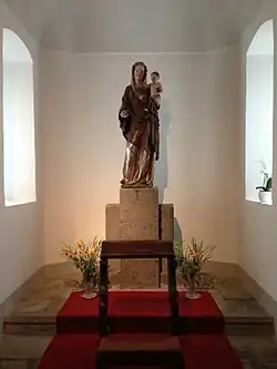 The convent of Aula Beatae Virginis (Hall of the Blessed Virgin) was established in 1355 by Eberhard von Wallsee, governor of Upper Austria, in a castle that he owned.[1] The abbey became the home of Cistercian nuns, who took up residence on 22 February 1355.[2] Schlierbach was also called Marien Saal (Our Lady's Seal). A 1762 description noted that it was "situate on an eminence, which gives it the agreeable prospect of the beautiful Kremsthal. This cloyster was erected in the year 1355, and is possessed of the citadels of Mossenbach, Hochhaus near Forchdorf, and Grub or Muhlgrub."[3] The Schöne Madonna sculpture held by the abbey was made for Albrecht II (the Lame) around 1340 and donated to the nuns.[4]