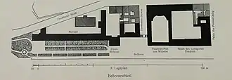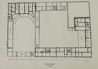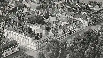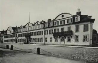 In 1866 Hesse was annexed to Prussia. The building was recovered by a branch of the princely family in 1880.[2] From 1933 until the Second World War it was the residence of Philipp, Landgrave of Hesse (1896–1980), during his tenure as President of the province of Hesse-Nassau.[3] In the mid-1930s Philipp made parts of the palace into a public art gallery, the Landgrafenmuseum.[4] When Philipp was arrested in September 1943 on suspicion of plotting with the Italian royal family to overthrow Mussolini, the palace was plastered with posters denouncing the Italian royalty.[5] Most of the palace complex was destroyed during Allied bombing raids in October 1943, with exception of the ‘Bellevue Palace’ building, which suffered little damage (although the north-eastern wing has been demolished).[6][1]