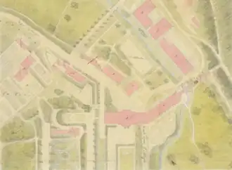 The former garden of the palace and the park, later including a cemetery, extended south of the palace in a trapezoidal shape, about one kilometer long.[2] Near the palace, the park was about 100 meters wide, and at the Stubbach, the right source stream of the Suhl forming the southern boundary, it was about 800 meters wide.[2]