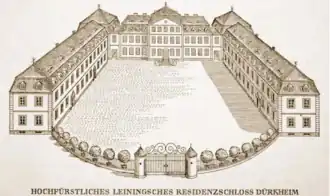 On 31 January 1794, the returning French Revolutionary Army burned down Dürkheim Palace and forbade any firefighting efforts.[1] As the lands on the Left Bank of the Rhine became permanently part of France, the princely family of Leiningen could not return, and the palace was never rebuilt. The French also destroyed the summer palace in Jägerthal.