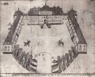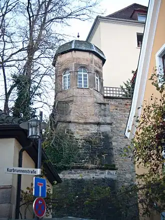 From 1560 to 1725, the Hardenburg castle was the main residence of the Counts of Leiningen-Dagsburg-Hardenburg. In 1725, they moved their residence to the centrally located town of Dürkheim, which also gained economic importance and became the capital of the county. To this end, the ruling Count Friedrich Magnus of Leiningen-Dagsburg-Hardenburg (1703–1756) had the Baroque-style Dürkheim Palace built as a residence between 1720 and 1725 on a hill at the northeastern corner of Bad Dürkheim.[1] To the north, he incorporated the medieval city wall as the outer boundary of the palace grounds. From 1739 onward, he extended or heightened this wall and laid out a garden between it and the palace, where today the buildings and parking lot of the Kurpark-Hotel are located. During this time, Count Friedrich Magnus had a Latin builder's inscription placed on the wall, which has been preserved. At the northeastern corner, the garden pavilion with a bell roof was probably built at the same time, and today it is the last remaining structure of the palace.