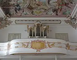 The appearance of the Schloss today is characterised by the reconstruction during the 18th century. The architect responsible for the rebuilding was François de Cuvilliés. He created the presently visible exterior and several of the interiors; during the reconstruction the house was also substantially enlarged. Among the interiors, the banqueting hall on the second floor, the so-called Golden Room and the chapel are especially noteworthy. The banqueting hall contains a ceiling painting depicting the four seasons, by Johann Georg Bergmüller, and two tile stoves from the Nymphenburg Porcelain Manufactory. Bergmüller also decorated the ceiling of the Golden Room, whose other decorations were designed by Cuvilliés. The chapel was decorated by both Bergmüller and Egid Verhelst and his sons.[1][2] The building was restored during the 1980s and another renovation was carried out in 1997-1998.[1]