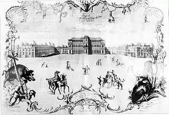 In the outskirts of Bonn, the capital of the Cologne Electorate, the ‘Kottenforst’ forest was a centre of such ‘par force’ hunts.[1] As from 1727, wide avenues were created.[1] And in the centre of these star shape radiated avenues, a hunting lodge was constructed between 1753 and 1761, Schloss Herzogsfreude.[1] The architect was Johann Heinrich Roth (1729-1788).[1]