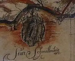 Before Schmallenberg received town rights, there had been a castle of Schmallenberg which must have been destroyed around 1240. It was owned by the Archbishop of Cologne Conrad of Hochstadt and the Grafschaft Abbey. The Knight Johann Kolve had the order to protect this castle. At this time, there already must have been some kind of settlement around. The archbishop did not consider the destroyed castle as useful any more. Furthermore, the local settlement was unprotected and in a risky situation because of the castle. That is why the archbishop and the Grafschaft Abbey wanted to fortify the place, leaving the old castle outside the town wall.[10]