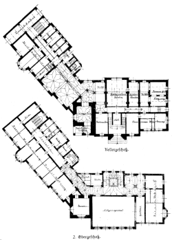 Numerous alterations over the years, necessitated by changing space requirements, have altered the interior appearance. For example, simple corridors in front of staff quarters were connected to public corridors with cross vaults, causing the vaults to end abruptly in present-day corridors. Light fixtures, doors, and partition walls added later often do not align with the original historicist appearance.[3]