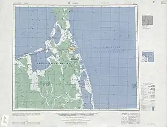 The Schmidt Peninsula is the northern extremity of Sakhalin Island. There are two roughly parallel mountain ranges stretching in a NNW/SSE direction. The mountains are covered with larch and spruce forests and are separated by a swampy valley. Cape Elizabeth is at the northern end of the Eastern Range and Cape Mary (мыс Марии), the northwestern headland, at the northern end of the lower Western Range. Severny Bay lies between them.[2] To the west lies the Sakhalin Gulf and to the east and north the Sea of Okhotsk. The highest point of the peninsula is 623 m (2,044 ft) high Mount Three Brothers (гора Три Брата), rising in the eastern range.[3][4][5]