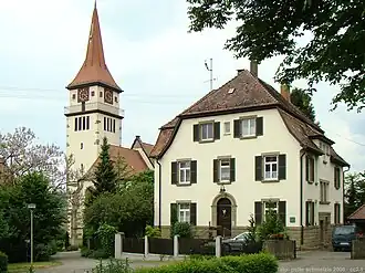 Early on the pair were influenced somewhat by the new style of Jugendstil, the German strands of Art Nouveau, popular around 1900 but quickly discarded amongst most German architects by 1905. Their completed residential commissions in the style include the Villa Schliz in Heilbronn (1901) and the Villa Franck in Murrhardt (1905–07), a castle-like mansion built on a hillside for a Ludwigsburg-based chicory manufacturer Robert Franck with a baroque exterior.[2] The latter includes a monumental staircase and forty-two rooms that employ Jugendstil décor and were technologically advanced for the time. In Murrhardt as well, they remodeled the Protestant parish church of St. Bartholomew, built in 1905–06, incorporating the late Gothic choir and tower into a new design that uses both Heimatstil and Jugendstil elements.[2] They employed a similar strategy in their contemporaneous remodeling of the evangelical parish church of St. Martin in Ebingen, choosing Jugendstil for the new sections of the building which they connected to the choir and sacristy, dating from 1473, and the lower part of the tower, originally built in 1670–72.[3]