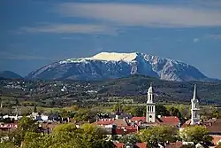 The Schneeberg is one of the Northern Calcareous Alps in the borderland between Lower Austria and Styria, in the eastern part of Austria. It and the Rax (2,007 m or 6,585 ft), some 13 km (8.1 mi) to the south-west, are collectively considered the Viennese Hausberge (Vienna's "local mountains"). The rich Karst plateaux have provided drinking water for Vienna, via a 120 km (75 mi) long pipeline, since 1873, and is claimed to be the best drinking water in the world.