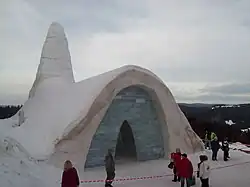 It was planned by architect Alfons Doeringer.[2] It cost €100,000,[3] or US $200,000 to build, using 1,400 cubic meters (49,000 cubic feet) of snow and slabs of ice.[4] The dimensions were 26 meters long and 11 meters wide with a 17-meter tower and there was space to seat 190 people.[5] Blue lighting elements were built into the ice, to enhance its appearance.
