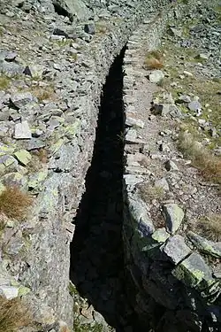 A schneekragen (German for snow collar) or schneehals (snow neck) was a safety corridor characteristic for alpine mining. Covered with lumbers or roundwood, it guaranteed somewhat avalanche-safe access to the adits during winter. Furthermore it protected the miners from cornices and ensured the passage of deep snow areas.[1] Miners' houses, workshops and processing plants were often connected through a system of schneekragens with the adits, so the miners did not have to shovel. The corridors, often built of dry stone, barely reached man-high and had to be crossed cowered down or crawling.[2][3] Because the entries were sometimes covered by cornices some schneekragens kept impassable and dynamite chests like other heavy equipment normally transported with horses had to be dragged through the danger zone.[4]