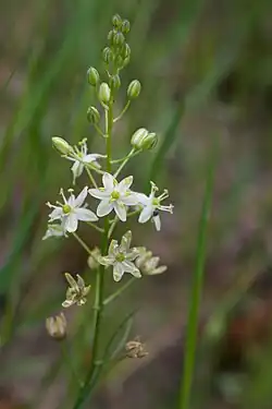 Schoenolirion wrightii, known as Texas sunnybell,[2] is a species of flowering plant in the Agave subfamily. It is native to the southern United States, in Texas, Louisiana, Arkansas, and Alabama.[3] Texas sunnybell produces vertical rootstocks topped with prominent bulbs, each up to 17 mm (0.67 in) in diameter. Between two and seven leaves are produced per plant, up to 34 cm (13 in) long and only 6 mm (0.24 in) across each, flattened to slightly keeled and usually shorter than the flowerhead. The ovate to lanceolate tepals are white with a green stripe on the back, mostly three-veined, but sometimes five-veined. Schoenolirion wrightii flowers between March and May, occurring in sandstone outcrops, wet pinelands, and boggy places.[3]