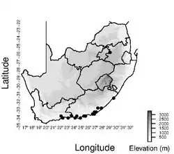 Schoenus loreus generally occurs within 200 km of the south-eastern and south coasts of South Africa.[1] A collection has been recorded from Mpumalanga Province, but is it It is unclear whether that specimen was collected from there or was mislabeled.[1]