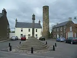 Abernethy's mercat cross and round tower in School Wynd, looking north from Main Street in 2013 | |